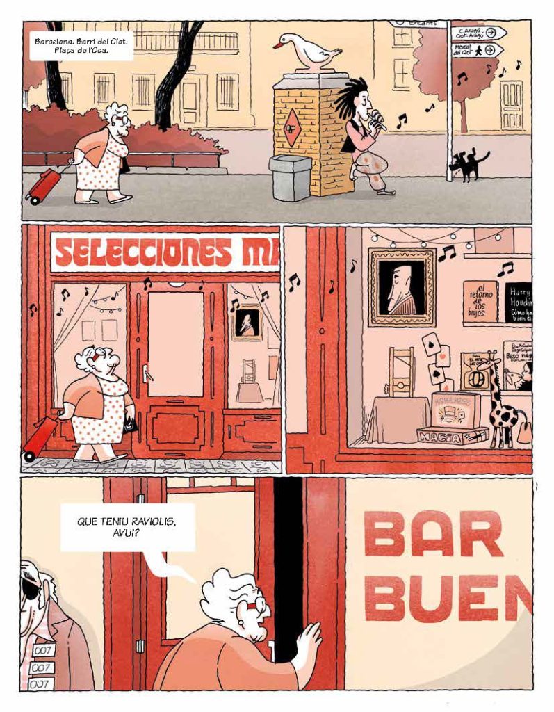 Ja fa anys que la senyora Marga viu sola al seu pis, a un barri de Barcelona. Tots els dies fa el mateix recorregut: passa pel davant de la botiga de màgia, para a la vora de la font de l’oca i saluda l’amo del bar on li agrada menjar raviolis i comprar loteria. Quan surt a caminar, es troba més segura agafada al seu carret d’anar al mercat. La seva filla la truca tots els dies. Tant si es queda sola a casa, com si va sola pel carrer, la Marga pensa molt en una amiga de joventut, la Júlia, de la qual un bon dia va perdre tota notícia. Es conforma, la Marga, amb aquest tipus de vida? I tant! Ella ja és feliç amb una vida sense ensurts. Però, un dia, de sobte, l’ànima de la seva benvolguda Júlia se li apareix dins del carret de la compra i li demana auxili. Resulta que, fa molt de temps, a la Júlia la va segrestar un vell vampir, anomenat Virgili, del qual, a més a més, es va enamorar.